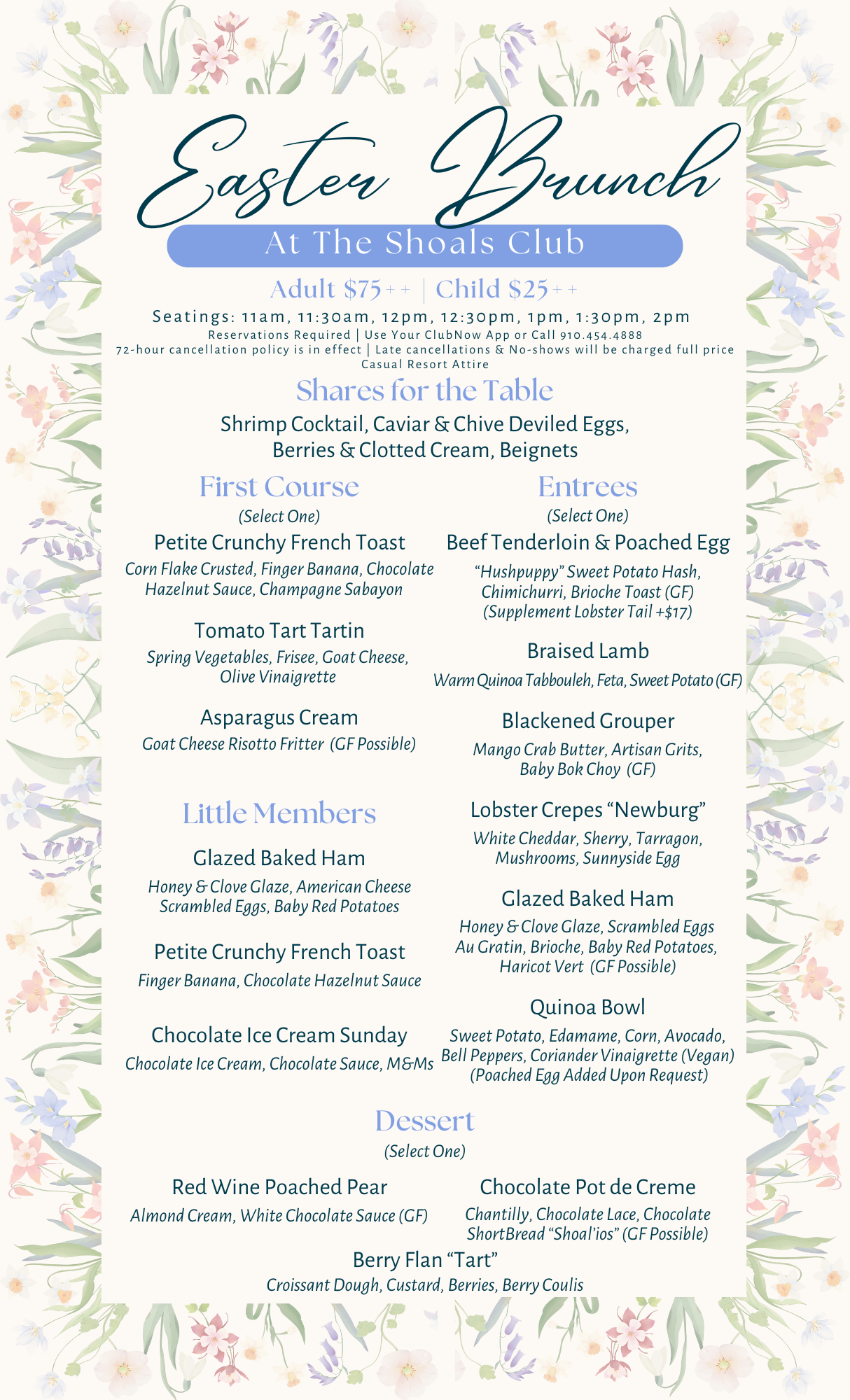 Bald Head Island Club presents an Easter Sunday Brunch on April 20, with seatings from 10:30 a.m. through 2 p.m. Reservations are required by calling 910-457-7300. AQUA, the Shoals Club’s fine dining venue, is also offering a special Easter Brunch. Seatings are from 11 a.m. until 2:30 p.m. View a menu.